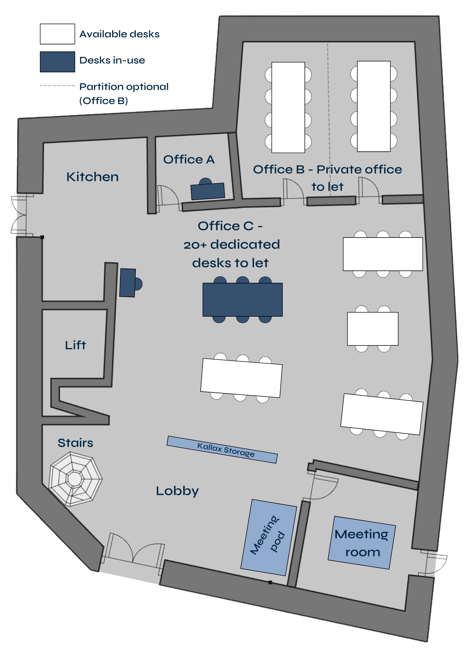 We offer dedicated desks, co-working, and have a recently refurbished small lockable office availiable to hire where we’re happy to welcome a single company or several smaller companies.